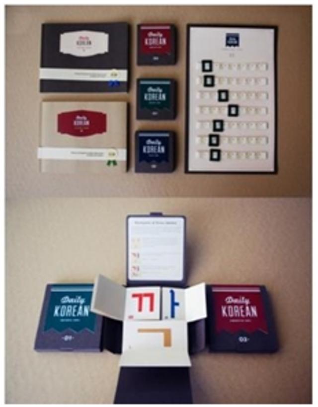 新加坡LASALLE Colleage of the Arts Jinyoung Sunwoo 设计的「Daily Korean」,其设计概念是来自她发现所有学习韩语的工具都是为在学校学习而设,并不适合自学用途。为要方便因个人或专业需要而学习韩语的外国人和第二代韩国人,更容易学到流利的韩语,她设计了此作品。「Daily Korean」的目的是为学习外语者带来更简单、更愉快的体验,因此设计充分运用平面设计,以互动手法让学习者积极地投入学习!