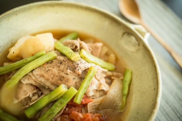 ③将除菜豆之外的蔬菜全部码入锅中,加入调味料,用中火炖煮。
