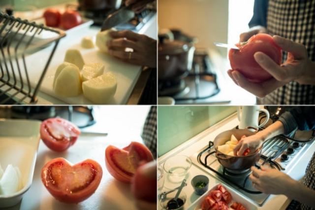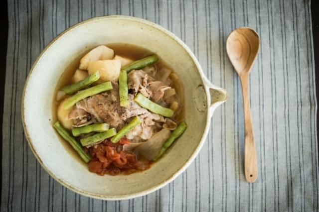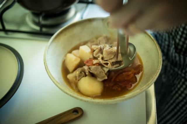 昌美说,这道菜在不同家庭中也有不同的改良做法。一般的土豆炖肉即是切成片的猪肉或者牛肉,根据地域的特产不同,关西常用牛肉,关东常用猪肉,再来就是马铃薯、洋葱等炖成一锅,而昌美的私房配方是特别添加了西红柿和菜豆,颜色和营养就更丰富了,味道也更有层次。注意,整道菜都没有放盐,最后析出的都是蔬菜的本味,混合着番茄的酸,非常精彩。