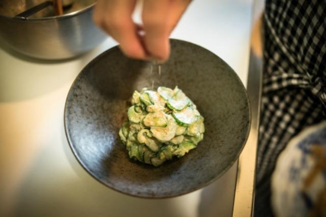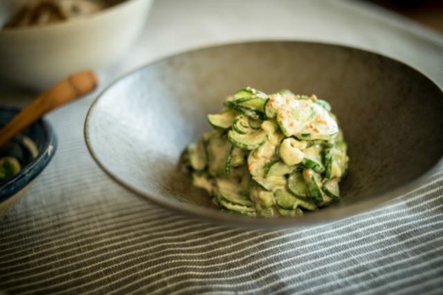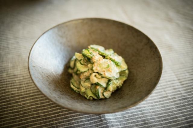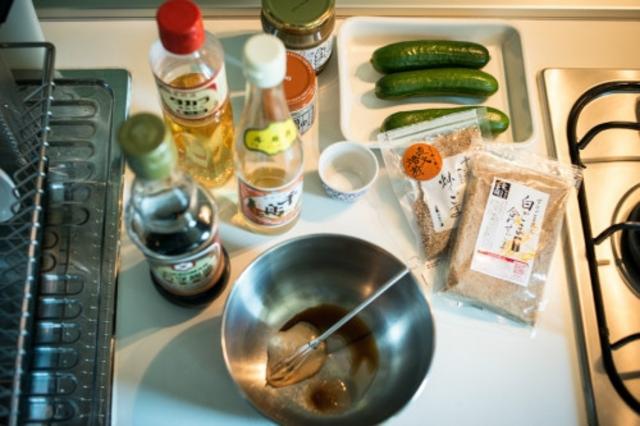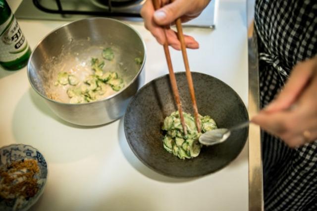 昌美说,日本料理,尤其是比较传统的日本料理中,“芝麻(胡麻)”扮演着非同小可的角色,同时也是日本人传统的蛋白质和植物油脂的来源。所以芝麻,芝麻酱,芝麻油都经常用来做菜和调味,特别是味道清淡的蔬菜搭配浓郁的芝麻酱,味道非常好。昌美告诉我们,今天这种用芝麻调味的凉菜,黄瓜也可以用菠菜、芦笋或者菜豆来代替,只需加以将蔬菜煮熟的步骤,在日式料理中相当于西餐中的沙拉:简单、可口、并保持了蔬菜本身的风味和营养。