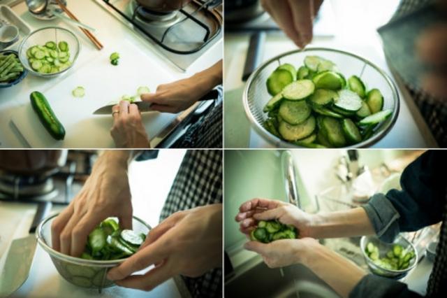 ④用手掌心握住黄瓜片,将剩余的水分挤出。
