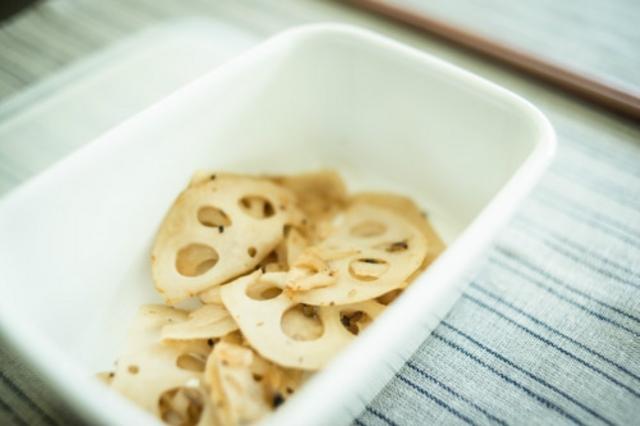 ①将藕根洗净切片,不要切太薄而失去了脆感;将小鱼干用剪刀剪成碎屑。