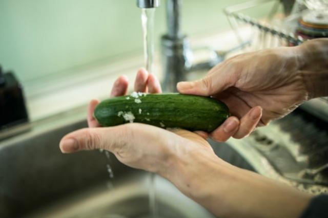①用盐粒将黄瓜表面的刺搓洗掉,再用清水冲洗干净。