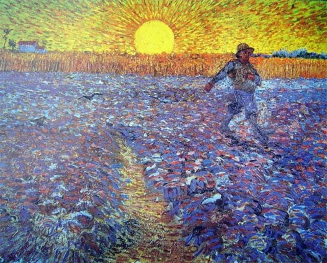 在《播种者》一画作,我们可以看到他在模仿米勒的同名作,但梵高与米勒的作品完全不同,图中的播种者,象是走在一条星光大道上,地面波光粼粼,象是耶稣走在水上的样子,呈现天堂般的美好。