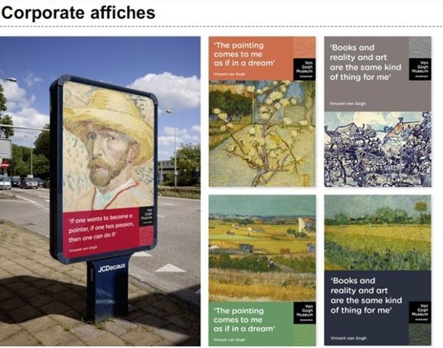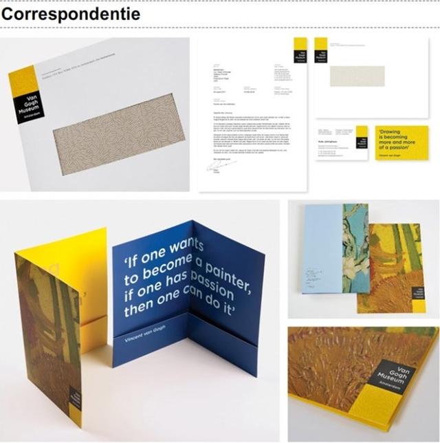 该博物馆的新形象采用了很多梵高的东西作为辅助及应用元素,包括那些充满特色的漩涡状笔触,他后期常用的黄及蓝色,并且在应用中还引用了他书信中的一些句子来构成。根据该馆的新闻报道: