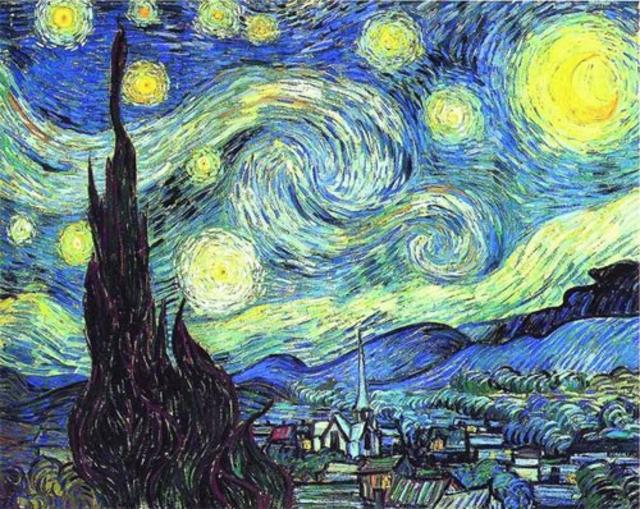 我们可以看到,其所说的那种笔触,在上述《星夜》一画中我们已经可以充分感知,它象是一种不甘于沉沦的对抗,一团永不熄灭的火焰,一股生生不息的力量,也更是梵高内心的激情及挣扎的真实写照。