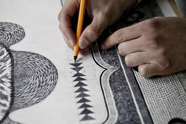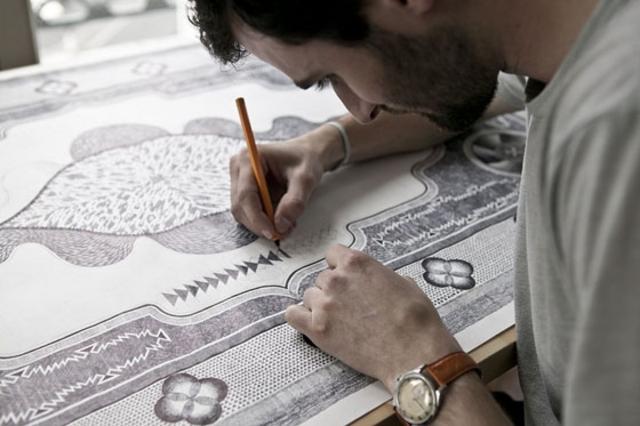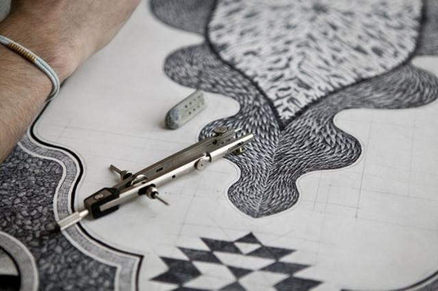 法国设计师Jonathan Bréchignac创造出世界上最复杂的地毯。不过这些地毯不是纺织物,而是由他一笔一笔在纸上慢慢画出来的。巨大的画幅上,每一个细节都如此一丝不苟。对于这种“慢”,Jonathan Bréchignac提到自己曾经在几家广告公司工作,在那里感受到一切都非常快,5秒钟的广告比比皆是。他希望做一个“大”事,每天每天完成很小一部分。怀抱着这样想法的他发现伊斯兰式的地图非常适合自己,伊斯兰设计通常是抽象的集合图案,这些够纯粹的图案让受了印度教文化影响的Jonathan Bréchignac觉得具有冥想的意味。当Jonathan Bréchignac绘制地图时,他仿佛是在冥想。