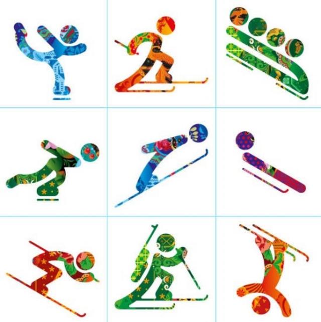 第一排左起花样滑冰、越野滑雪、有舵雪橇;第二排左起速度滑冰、跳台滑雪、无舵雪橇;第三排左起高山滑雪、冬季两项、自由式滑雪