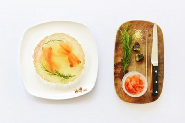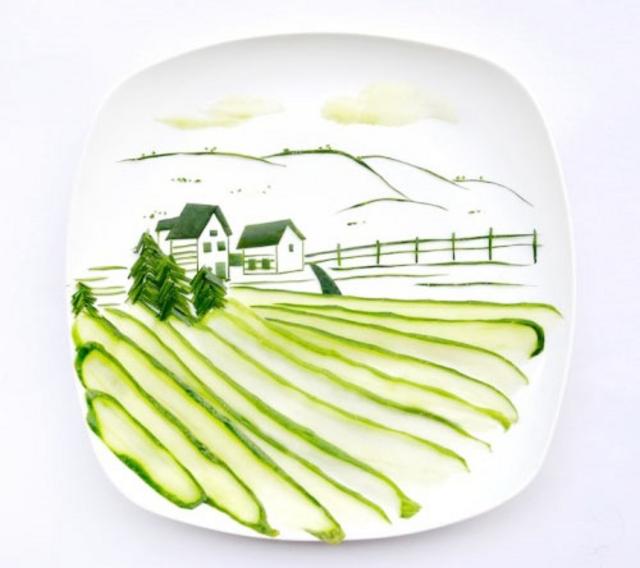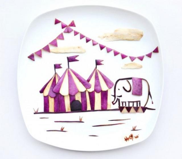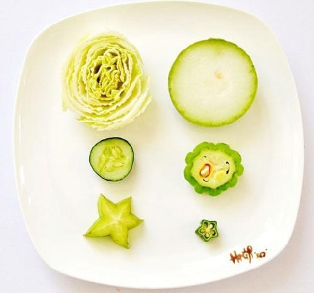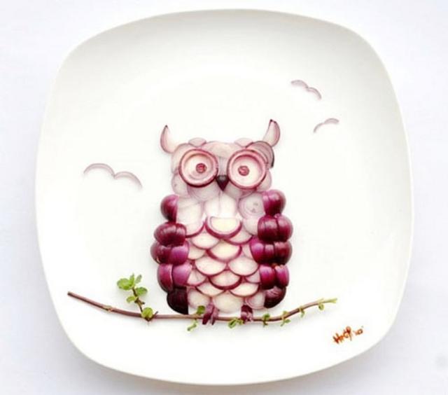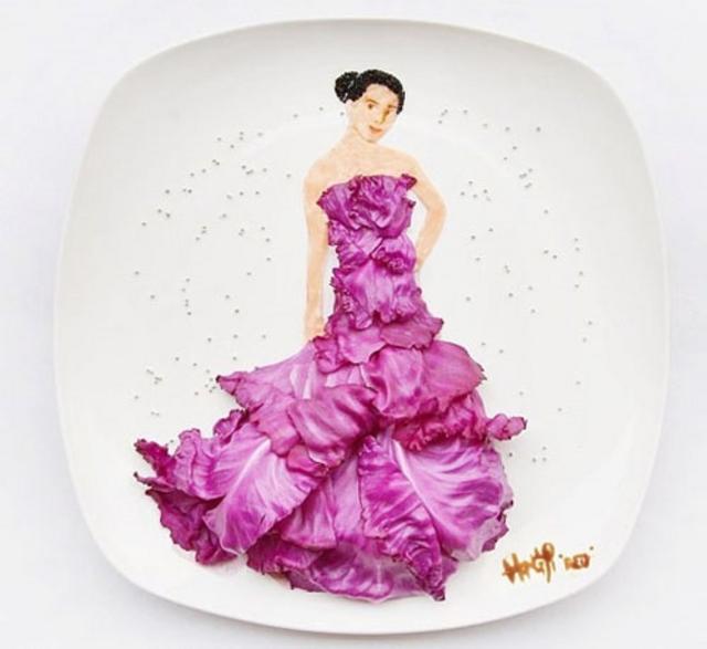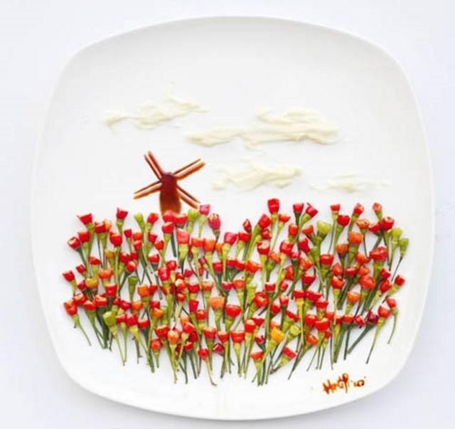 她巧妙地利用不同蔬果的形态、颜色将风景或人物形象完美诠释在白瓷餐盘里,黄瓜铺成的稻田,红辣椒梗拼成的郁金香,紫甘蓝制作的飘逸礼服,洋葱组成 的猫头鹰……她还热爱收集颜色各异的花瓣,一朵朵的花瓣像极了轻柔的羽毛,似风般飘逸,她用不同颜色的花瓣,搭配树枝,树叶,绘成一只只禽鸟:有公鸡,翠 鸟,犀鸟,火烈鸟,鹰;或是仅仅随心所欲地构造一些其他的图案。我们也总能在这一件件作品中感受到康怡热爱生活和善于发现美好的情怀。