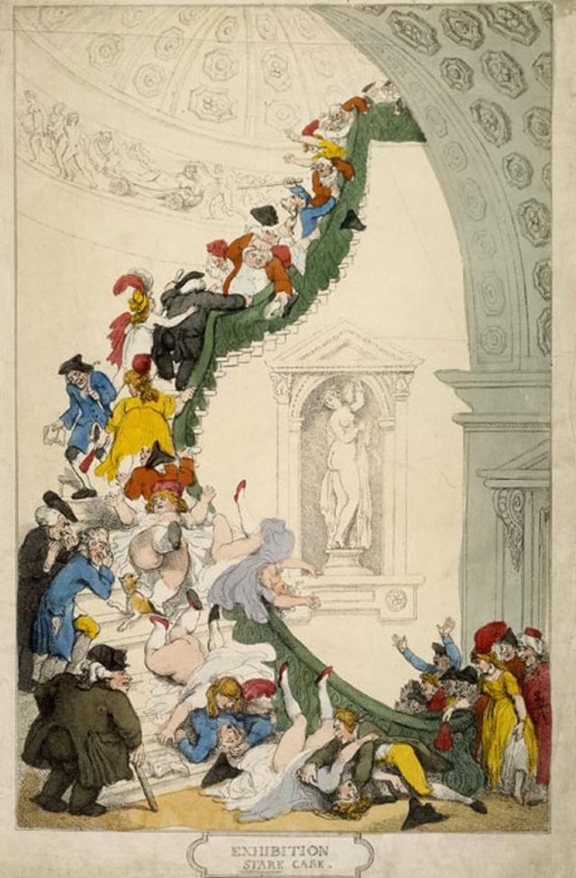 在一个追求快感的时代里,情欲的喷薄仿佛无处不在。在摄政时期的漫画家托马斯·罗兰森的《博“览”》中,“鉴赏家们”正钻研着皇家艺术学院旋转楼梯上不慎跌落的女子的底裤。(今天,原来的楼梯被用在了科托德画廊)。
