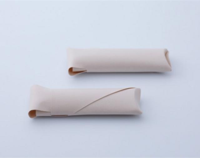 katamaku不只是一件产品,而是一种新材料在设计上的运用以及通过设计简化制作流程让用户能够自己参与制作完成设计。katamaku系列采用的是来自物流和仓储中的一种保护膜材料,一种树脂的纤维织物。因为其很多都在被使用后被丢弃,而其本身具有很好的美感和制作产品的特性所以被选为基础材料进行设计。