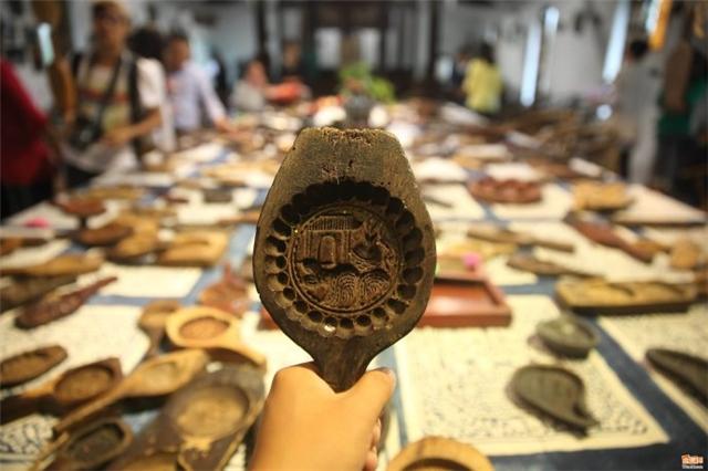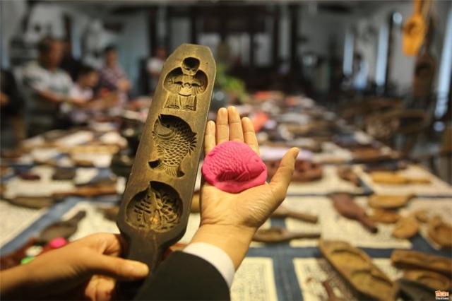 此外,古代月饼的造型非常多,除圆形外,寿桃型、金鱼型、并蒂莲型、元宝型都不少。“过去的饼模制作不少是‘量身定制’,所谓‘三分看主人,七分在工匠’,工匠会根据主人的要求和身份加上自己的创作。商人喜欢‘步步钓金钱’、‘年年有鱼’,文人喜欢淡雅的菊花、牡丹。工艺水平的高下还受主人经济条件的影响。”宣繁秋说,现代商家宣传的“超级大月饼”,其实古代就有。在博物馆展示现场,一个清代缠枝莲福字月饼模是现场个头最大的,用这个模具做出来的月饼直径至少有二三十厘米。不过解说员说:“馆藏最大的一个月饼模直径在60多厘米。”而现场最小的一个月饼模可一下做出8个小月饼,每个仅有今天的一元硬币大小。