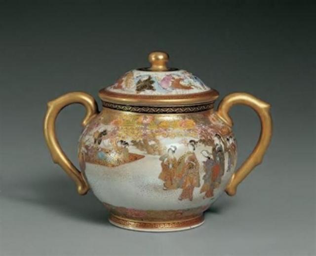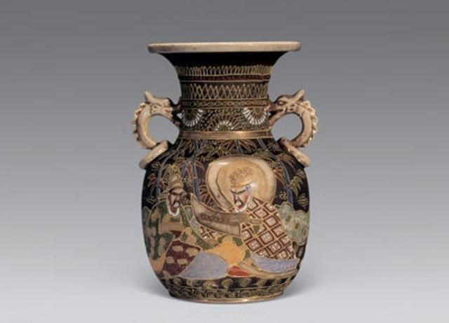 最初萨摩陶器是来自韩国的艺人为萨摩蕃王烧制的陶艺品。最早的萨摩在日本的鹿儿岛烧制,称为本萨摩,随后烧制萨摩的地方还有京都、东京、横滨、大阪、神户、金泽等。早期作品的风格类似于朝鲜瓷器,而现在收藏家提及萨摩陶器时,大都是指在淡白或米黄细开片地上绘色泽鲜艳的釉上彩及金彩的人物神仙故事及花鸟鱼虫装饰。日本人物的画意夸张传神,宫廷生活写实精细。萨摩陶器在18世纪中后期开始创作,但有一定的宫廷规格。在19世纪明治维新后,艺人不再受到蕃王的创作限制,从而达到艺术上的顶峰。萨摩的陶土选自附近山中特别适合烧陶的白土及白沙,将其搅拌均匀后,压碎,浸水,再用丝布多次淘滤选出最细的陶粉。早期作品作者在底部以蓝料彩签名,也有用金彩在黑框或红框内签名的,通常以作者名和作坊地点为主。如果签名在器物的侧面,则通常只有人名,早期较著名的作者有寿宫、明玉山和政信等。
